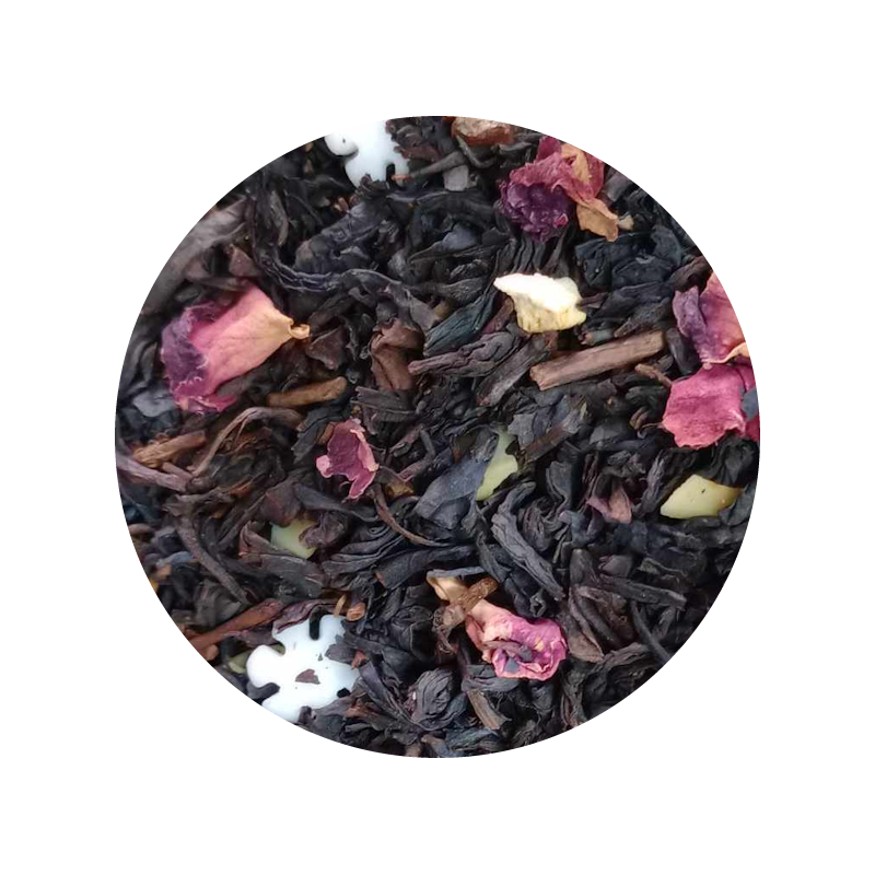 Chá Preto, Casca de Laranja, Amêndoa, Canela, Sementes de Cardamomo, Bolacha e Pétalas de Rosas