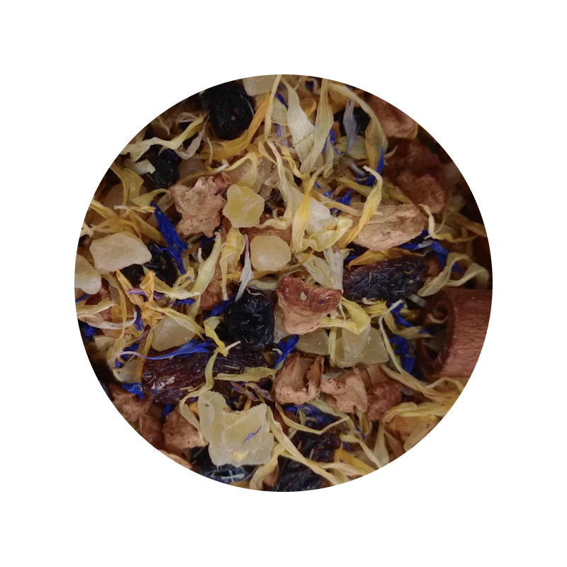 Ananás, Manga, Maçã, Passas, Corintos, Canela em Pau, Calêndula e Centáurea Azul